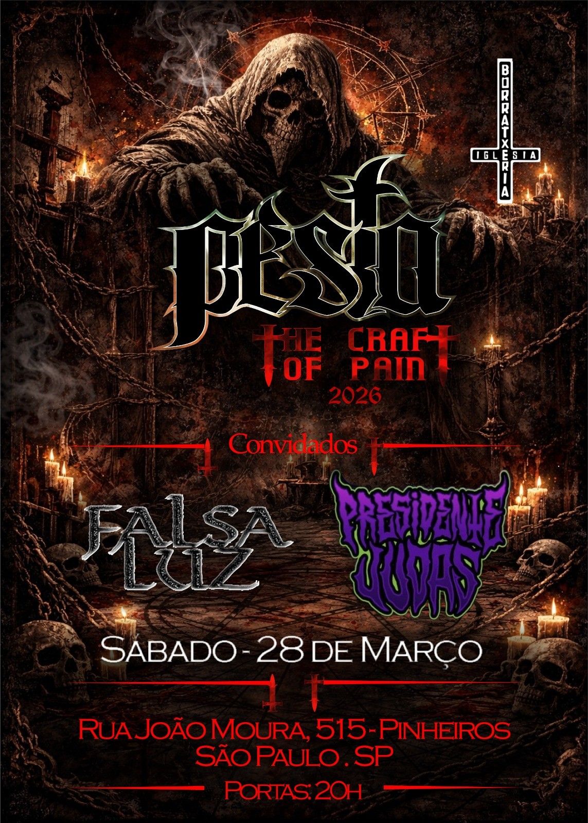 Já no dia 28 de março (sábado), o Pesta sobe ao palco do La Iglesia (Rua João Moura, 515 – Pinheiros – São Paulo/SP). A abertura será das bandas Falsa Luz e Presidente Judas. As portas abrem às 20h. Datas confirmadas da “The Craft Of Pain Tour 2026”: