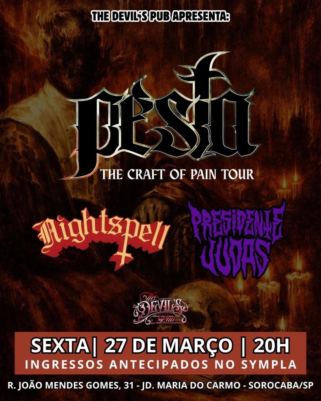 07/06 – Conselheiro Lafaiete/MG @ Heavy Fest Novas datas serão anunciadas em breve. “The Craft Of Pain”, lançado no segundo semestre de 2025, é o terceiro e mais elogiado álbum do Pesta até o momento. A discografia da banda ainda conta com “Bring Out Your Dead” (2016) e “Faith Bathed in Blood” (2019). Além da turnê, o Pesta também participa do concurso “Temos Vagas”, da 89FM, concorrendo a uma vaga no Lollapalooza 2026.